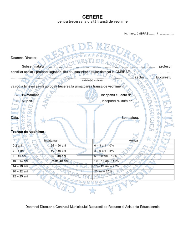 Cere oferta servicii de salarizare. Documents similar to model cerere trecere alta transa vechime. Certificatul de inregistrare a firmei la registrul comertului, in copie si in original copia documentului de trecere a frontierei valabil (pasaport, titlu de calatorie etc.) al strainului si este sportiv profesionist si are dovezi ca a desfasurat o activitate similara in alta tara